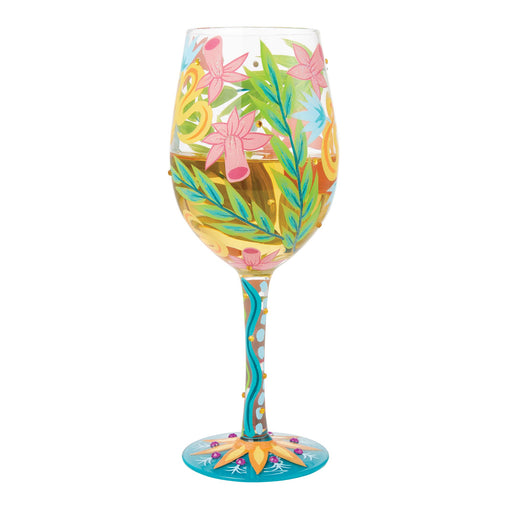 This vibrant glass from Lolita Designs adds exotic flair to any evening. With tropical flowers and leaves, the hand-painted wine glass delights wit...