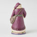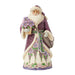 The stunning purple Santa representing Jim Shores trademark color. Radiating elegance in rich purples, plums, and greens, carrying a vibrant purple poinsettias. His intricately detailed cloak features delicate rosemaling, while his robes bloom with fes