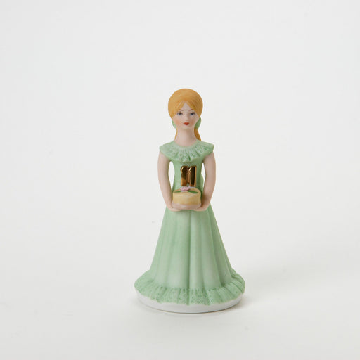 An adorable brunette girl stands wearing a light green dress, her hair tied back with the same color green ribbon. A 3-D golden number "11" rests o...