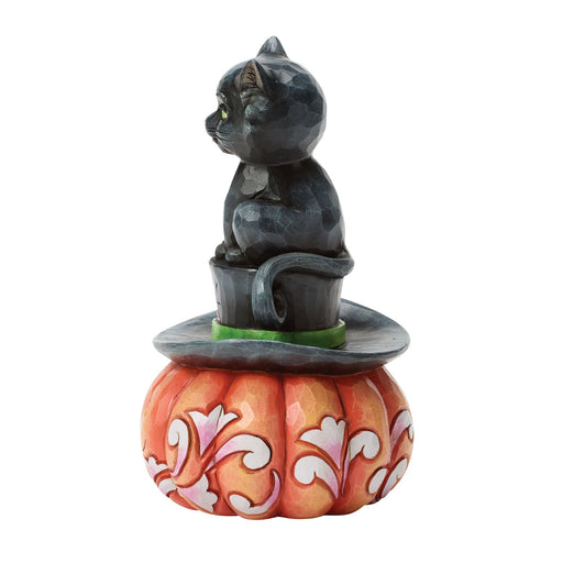 IN STOCK AND AVAILABLE ON 05/15/2026. A black cat sits perched atop a jack-o'-lantern's top hat, its rosemaling chest fur adding a touch of whimsy....