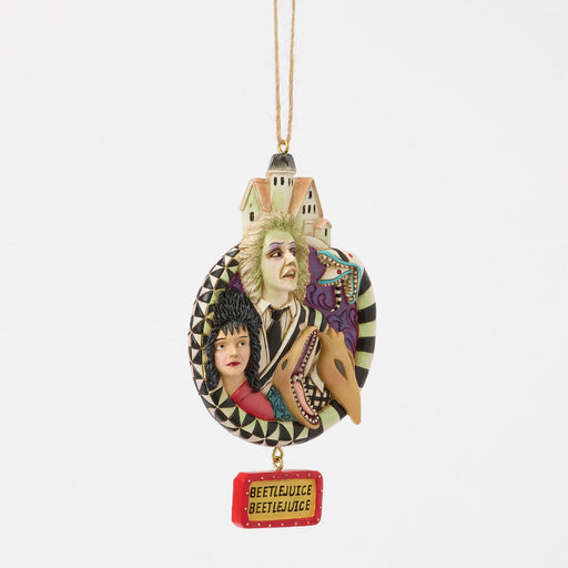 This whimsical Jim Shore ornament showcases the beloved characters from Beetlejuice framed by the film's iconic sandworm, bringing a touch of playf...