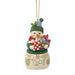 This charming snowman ornament by Jim Shore inspires holiday happiness. Keeping warm wearing a patterned knitted sweater, holly trim hat, and billowing red scarf this snowman boasts rosy cheeks in the chilled air. He smiles with arms full.