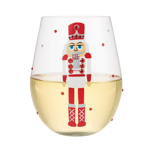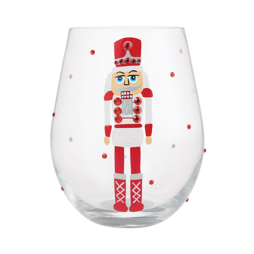 IN STOCK AND AVAILABLE ON 07/15/2026. Toast the season with this Lolita stemless wine glass, showcasing a red and white nutcracker with sparkling b...